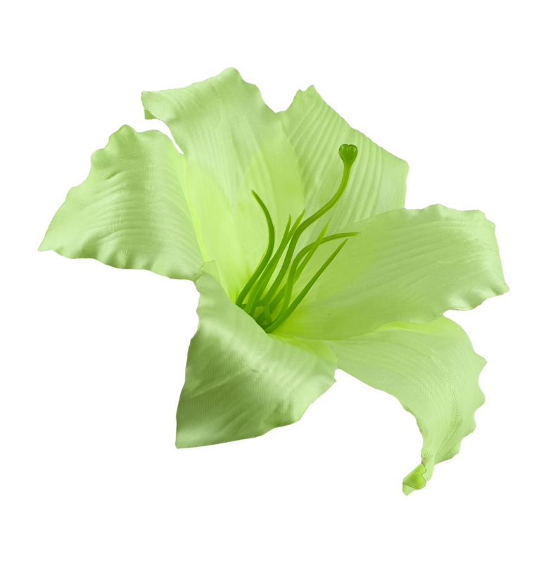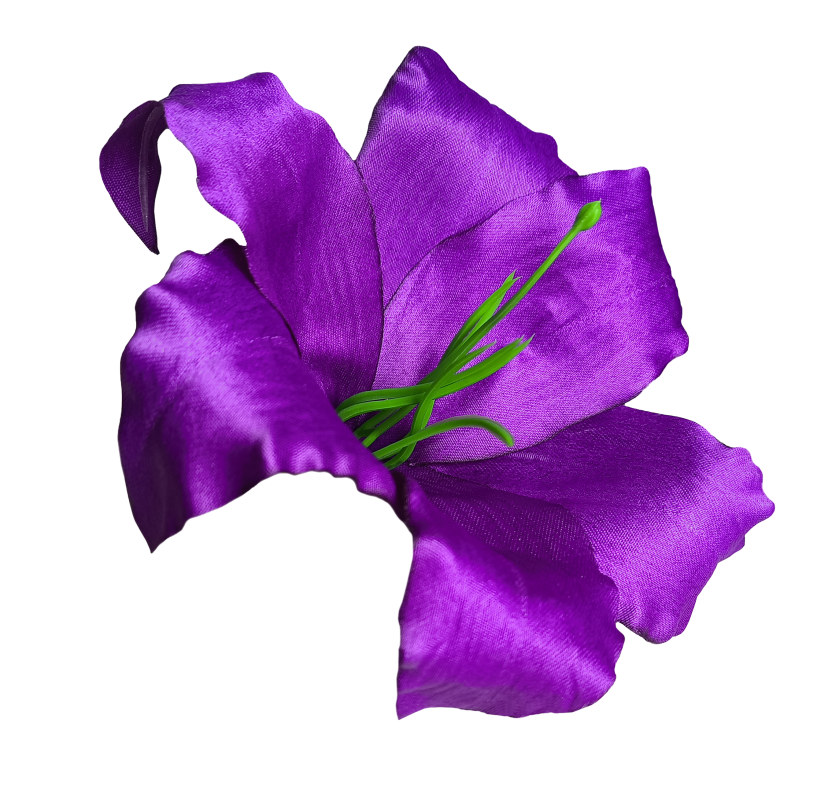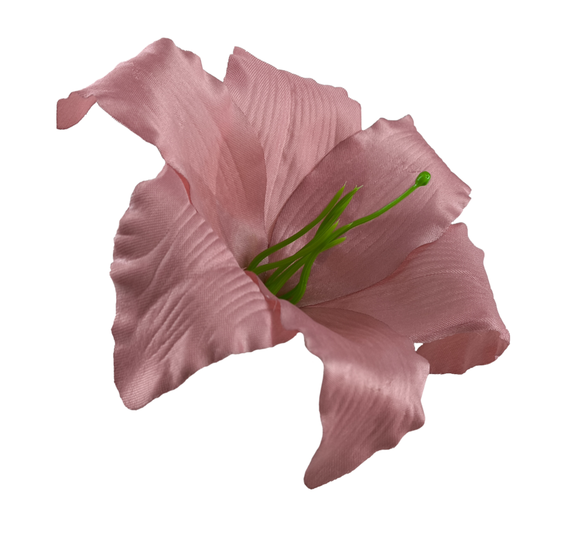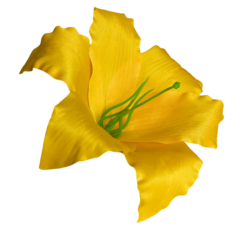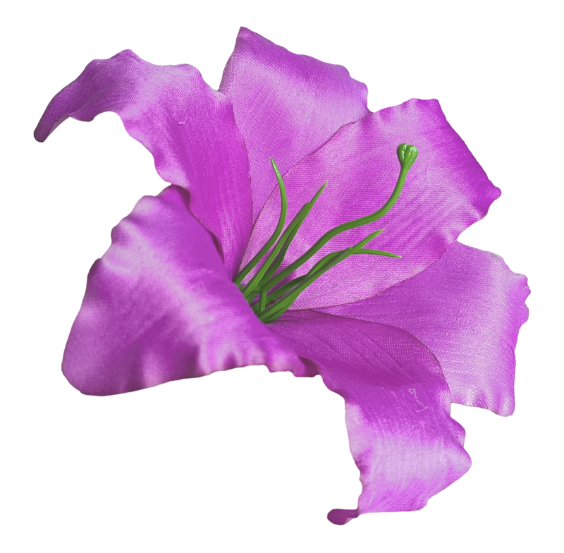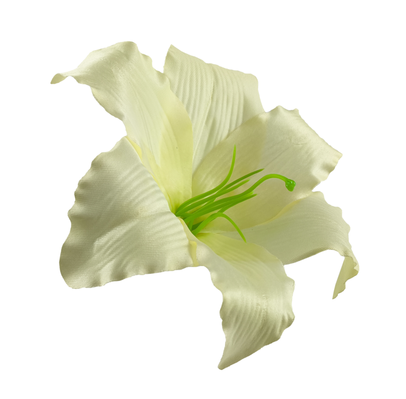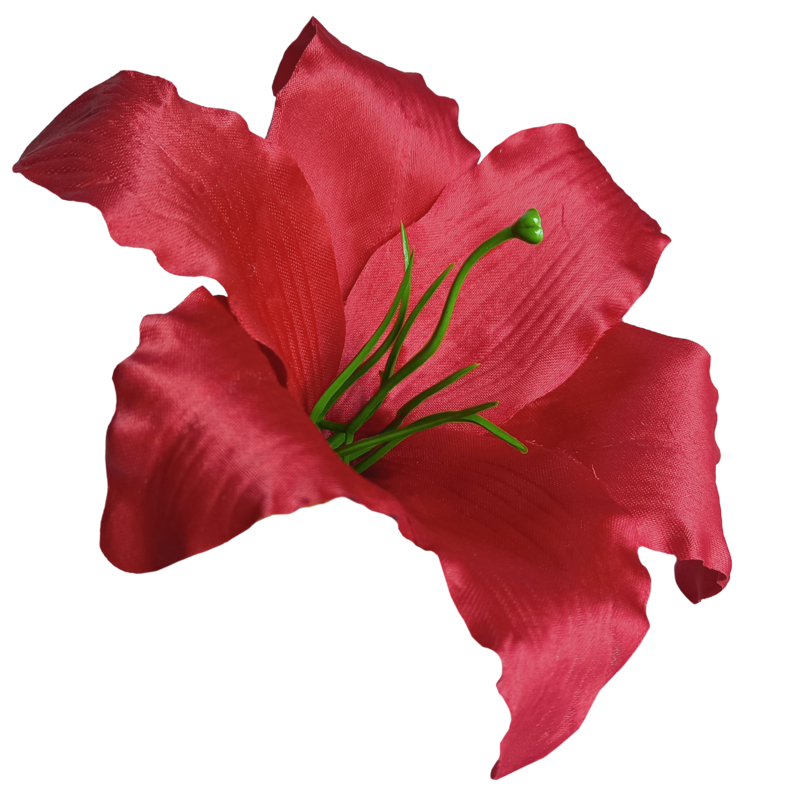 Штучна квітка "Лілія 06" із вигнутими, реалістично текстурованими пелюстками. Виготовлена з високоякісного текстилю, що надає квітці природного вигляду. Серединка оформлена зі стійкими декоративними тичинками, що підкреслюють деталі форми. Підходить як для самостійного використання, так і для створення декоративних або ритуальних композицій.