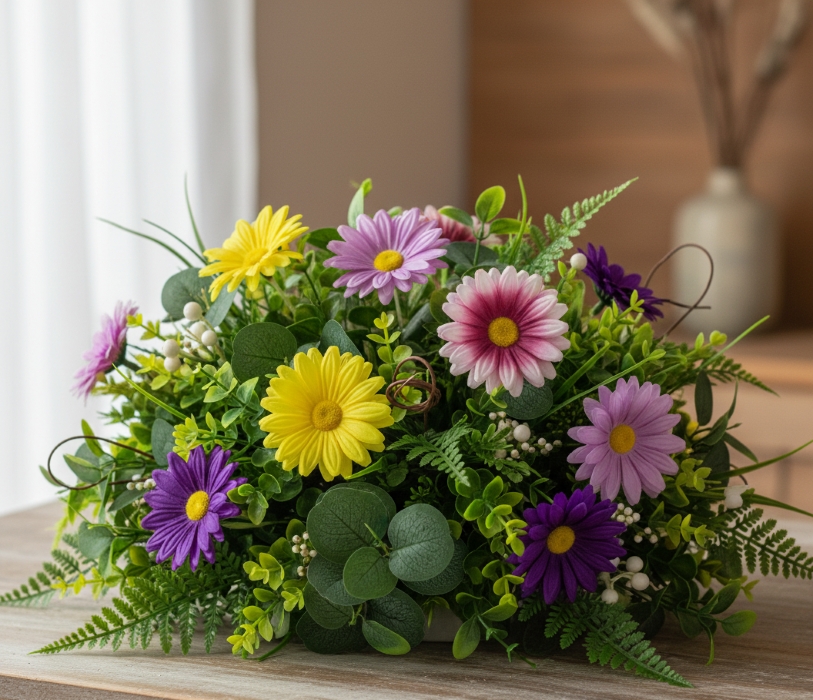 Штучна мальва — об’ємна декоративна квітка з м’якими пелюстками, ідеальна для створення ритуальних, інтер’єрних та флористичних композицій.