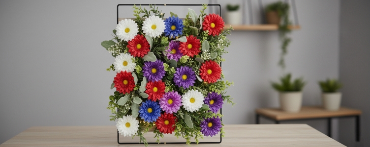 Окрема штучна квітка Ромашка G8 виготовлена з високоякісного текстильного матеріалу. Має щільну, багаторядну структуру пелюсток, які рівномірно розміщені навколо контрастного серцевини. Завдяки геометричній симетрії та яскраво вираженому центру квітка виглядає виразно та привабливо.