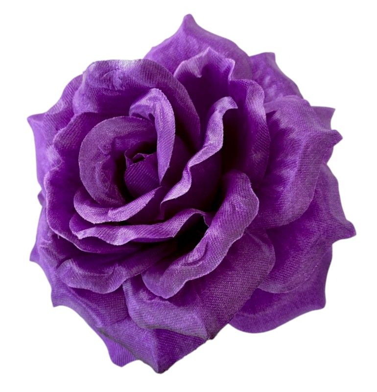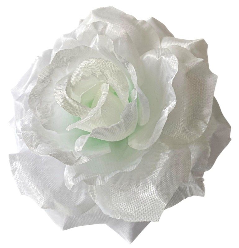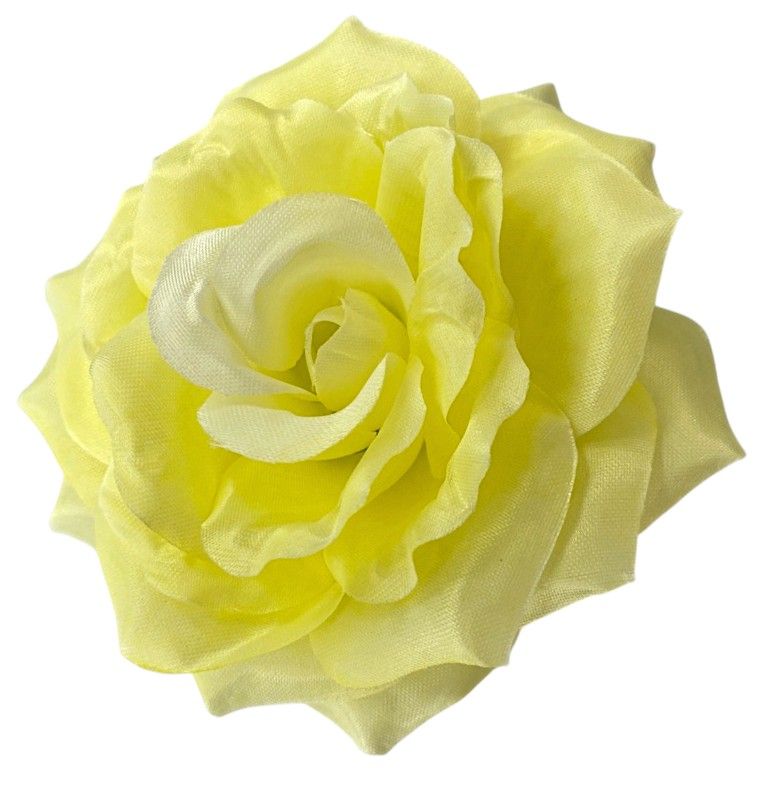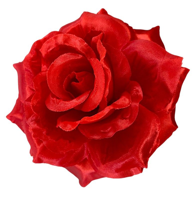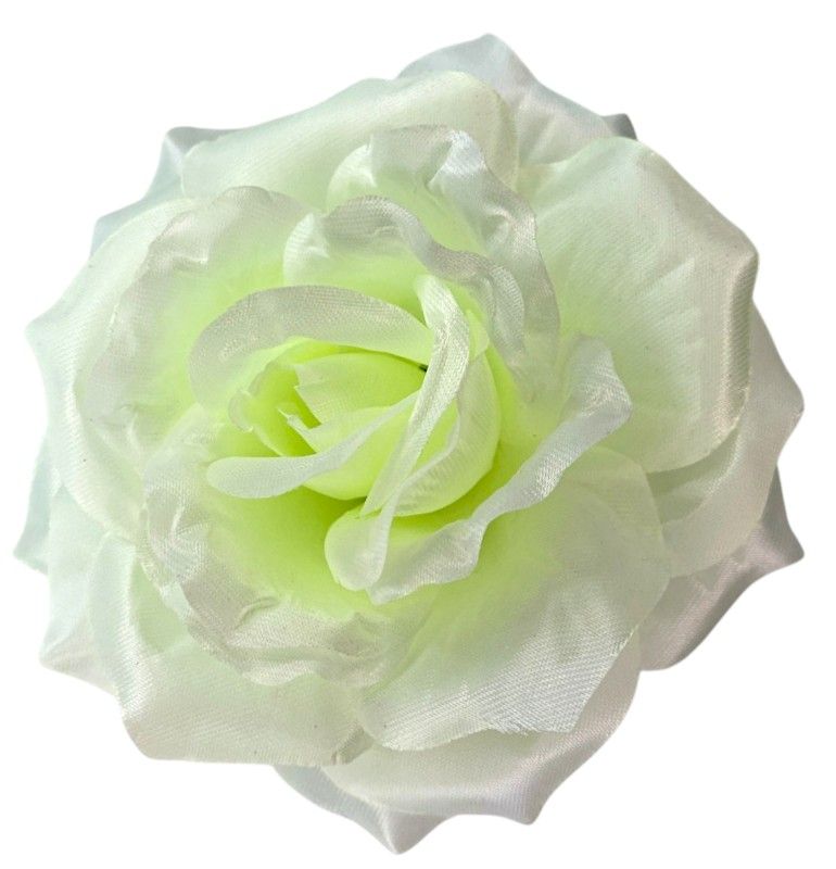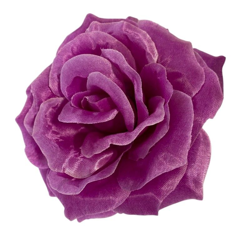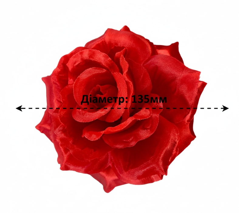 Об’ємна текстильна троянда з класичними м’якими пелюстками, які утворюють природну форму розкритої квітки. Центральна частина щільна, з дрібними, ретельно сформованими пелюстками, які переходять у більші зовнішні пелюстки хвилястого краю. Квітка виглядає природно та вишукано. Не має додаткової фігурної основи, що робить її універсальною у використанні.