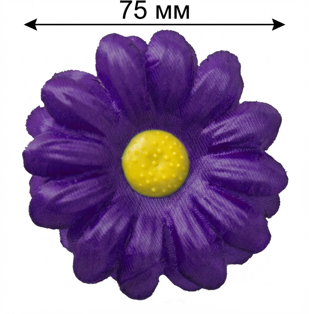 Компактна штучна ромашка з округлими пелюстками, виготовленими з текстильного матеріалу з легкою фактурою. Центральна частина — гладка, куполоподібна, з рівною поверхнею. Конструкція квітки легка, добре тримає форму, підходить для декору, флористики та оформлення невеликих композицій.
