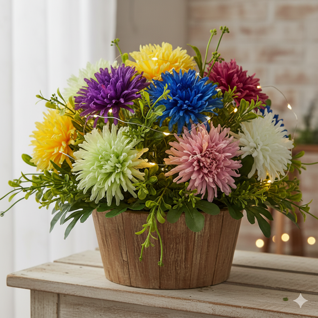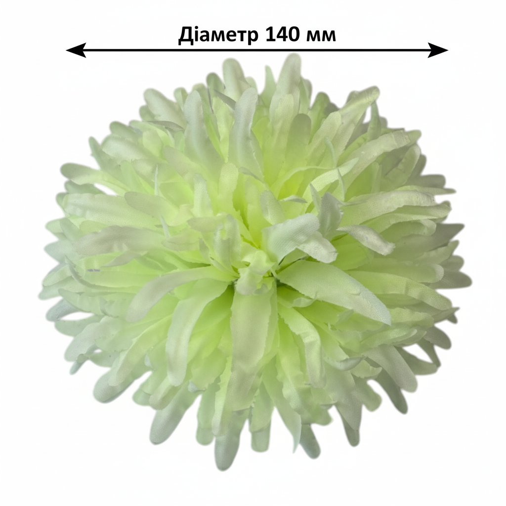 Штучна квітка "Хризантема 02", виготовлена з текстилю високої якості, має об’ємну, густу форму з численними хвилястими пелюстками, які створюють пишний кулястий силует.