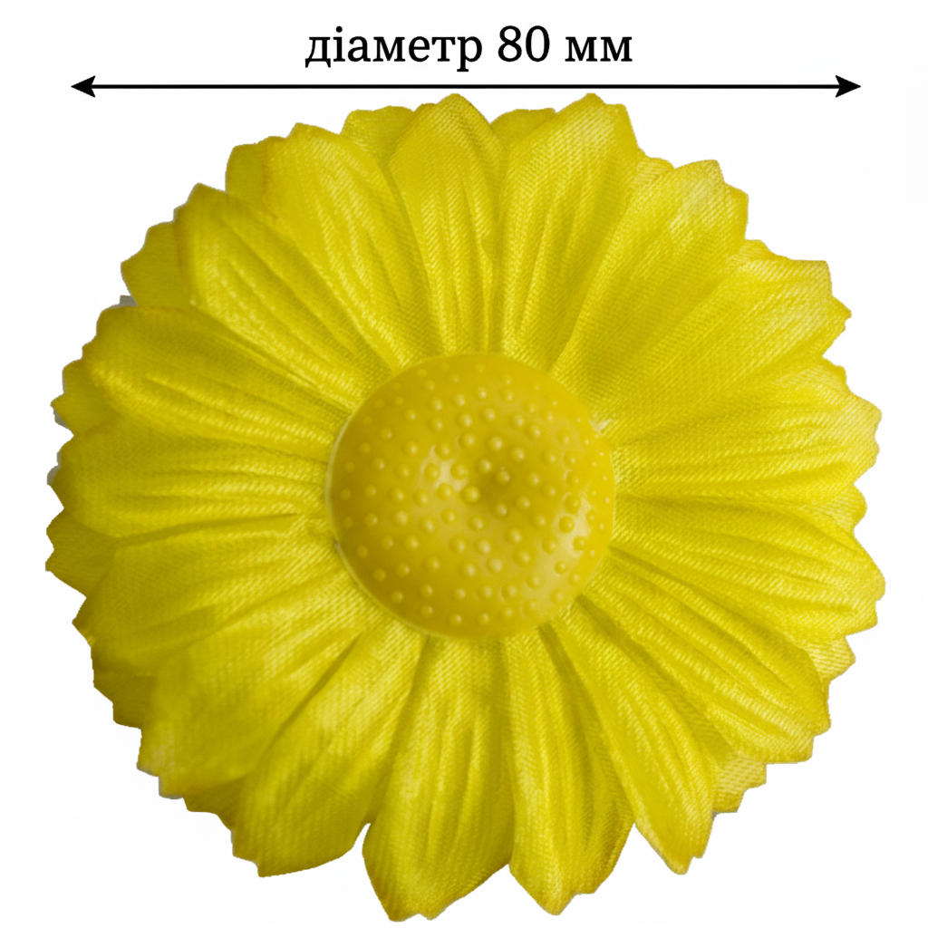 Класична ромашка з естетично оформленими пелюстками з текстильного матеріалу з приємною сатиновою фактурою. Центральна частина квітки — рельєфна, округлої форми, з декоративною поверхнею, що надає їй реалістичності. Компактна за розміром і добре зберігає форму, підходить для різного роду оформлення.